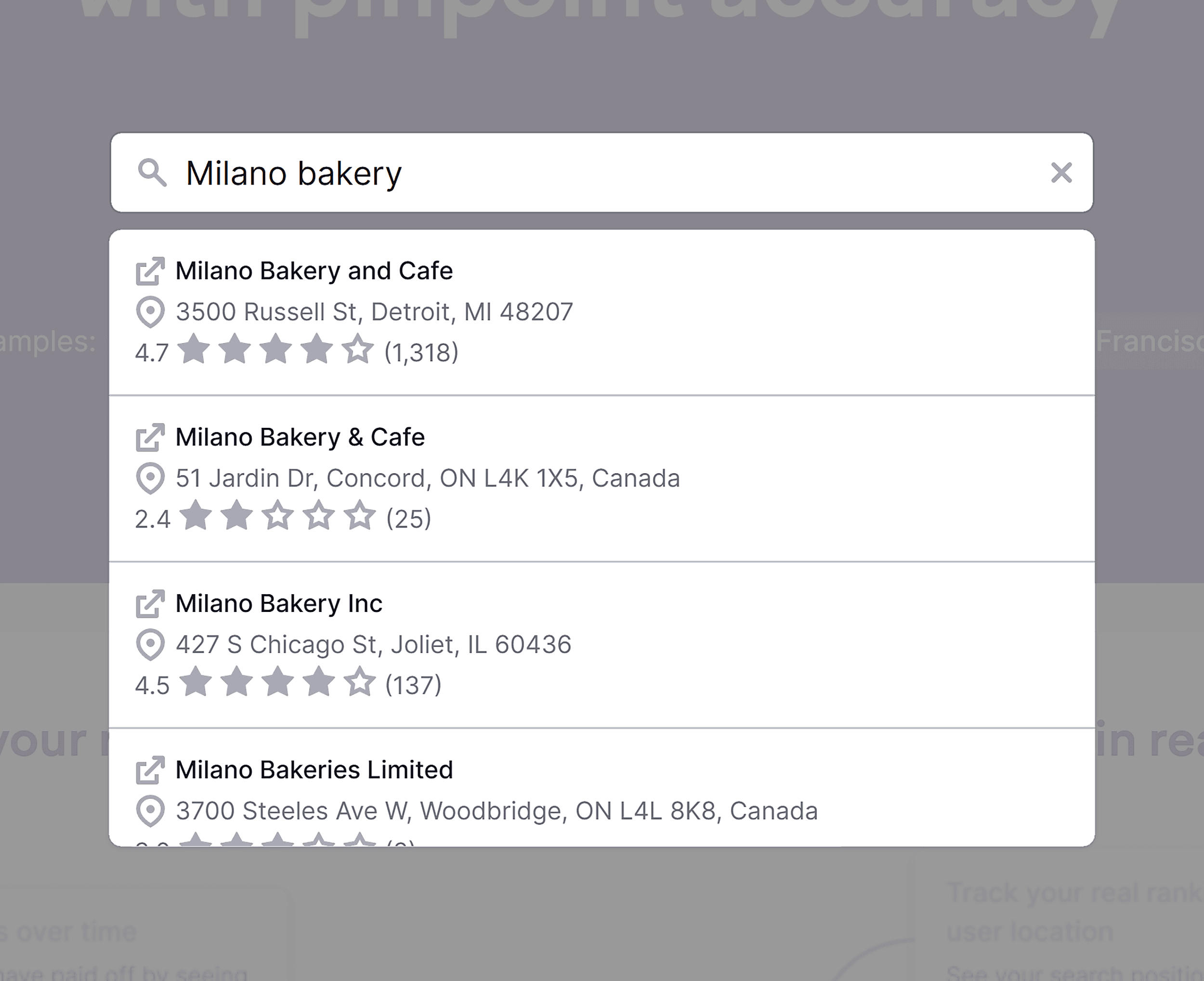 For example, let’s say you want to check local rankings for a bakery. Type the name in the search bar and select it from the drop-down.